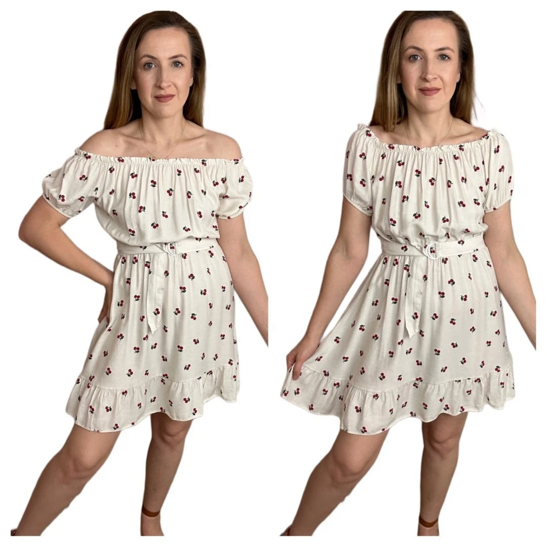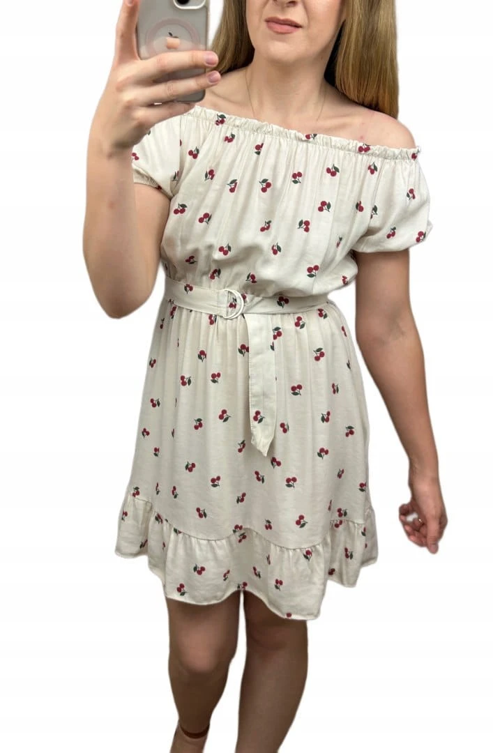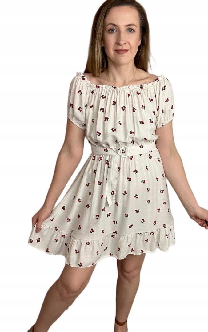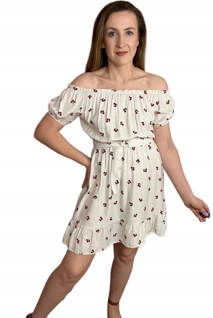 Gumka przy dekolcie umożliwia noszenia jako hiszpanki, dzięki czemu sukienkę można nosić na dwa sposoby. Krótkie rękawki zakończone gumką. Gumka w pasie, do sukienki dołączony pasek, dzięki czemu można jeszcze bardziej podkreślić talię.