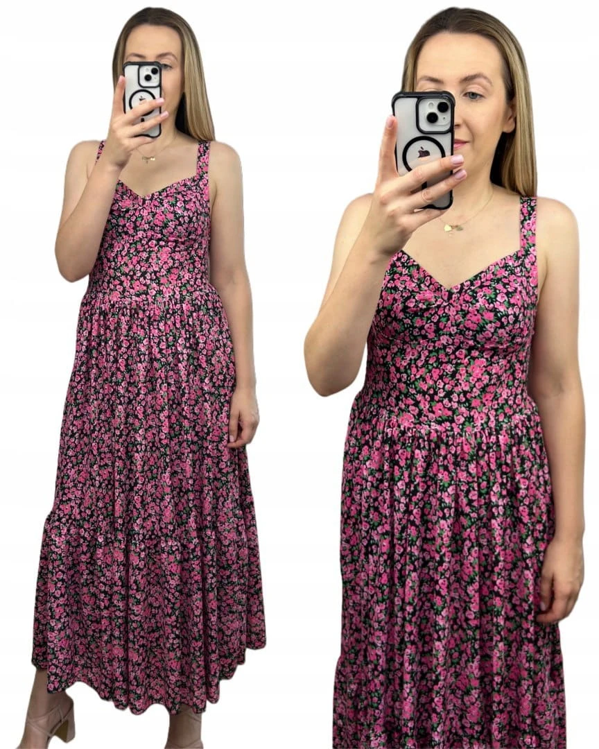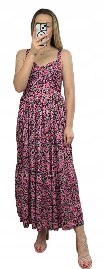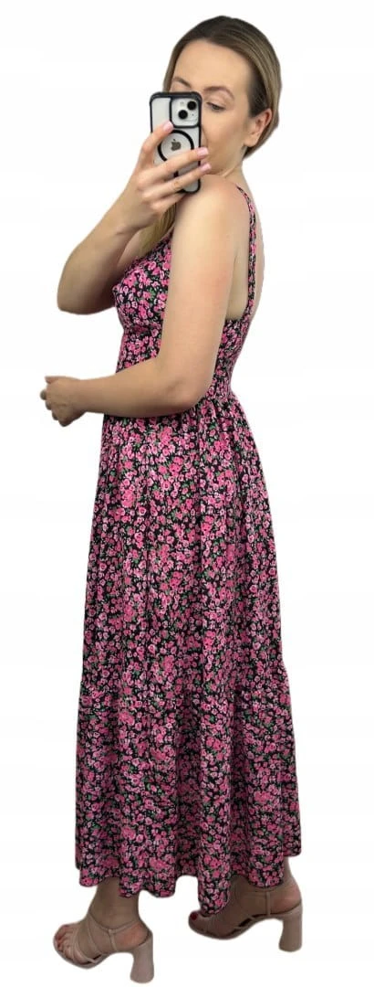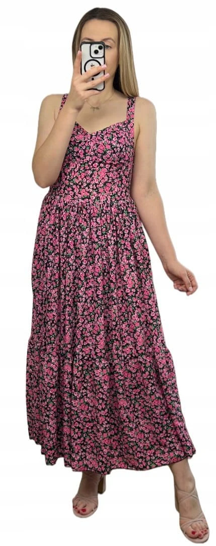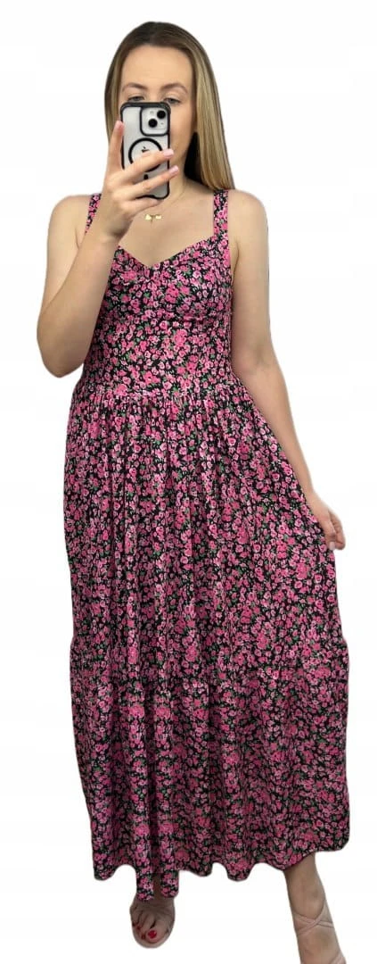 Sukienka maxi długa na ramiączkach gorsetowa góra w kwiaty wiskoza różowa