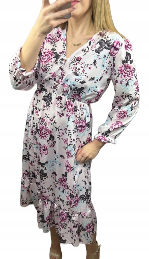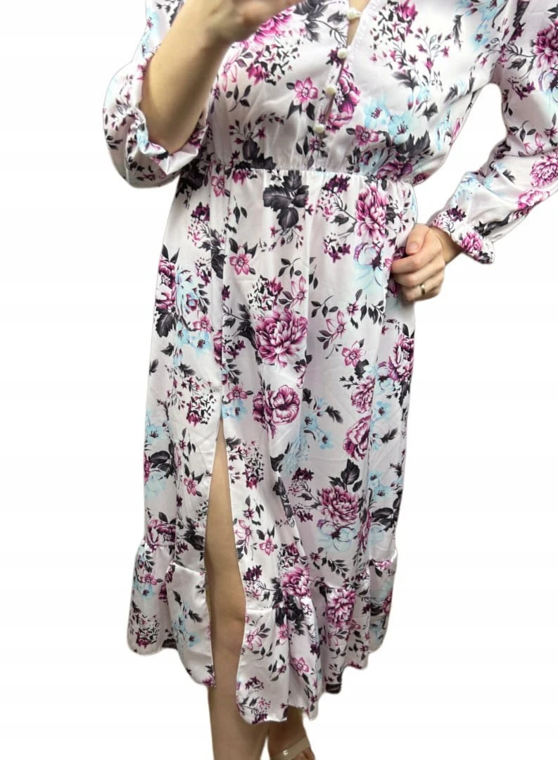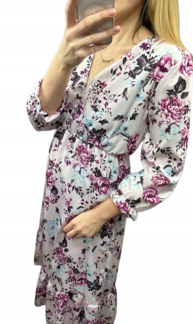 Sukienka midi dłuższa guziki kwiaty uniwersalna wiskoza falbanka wiosna S M