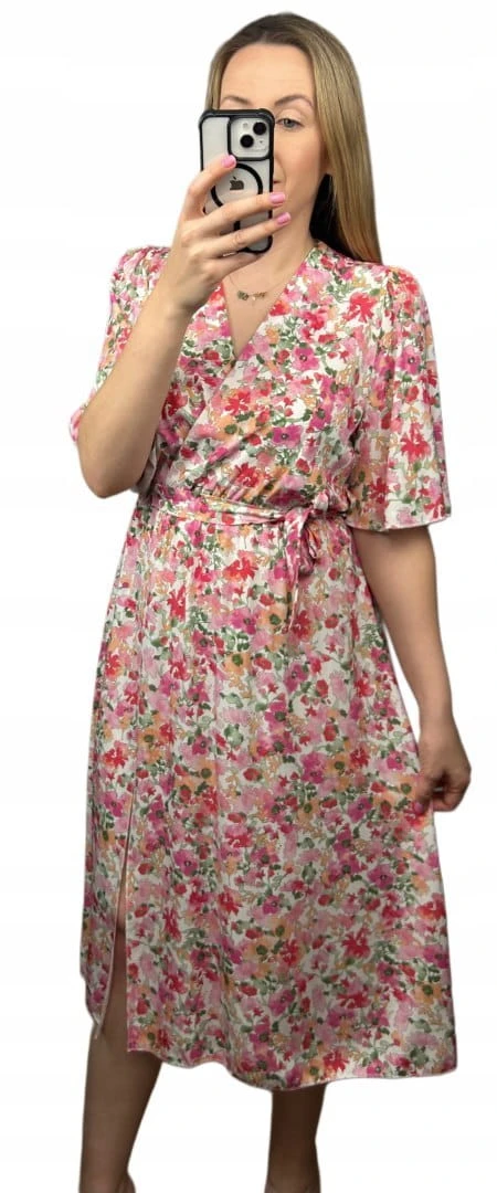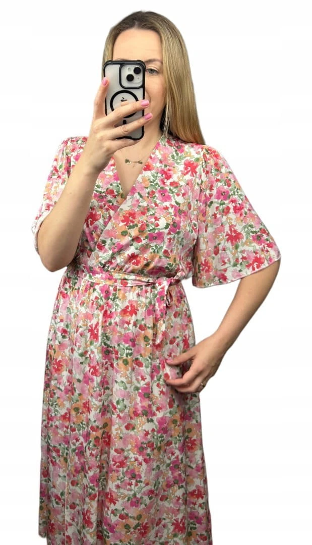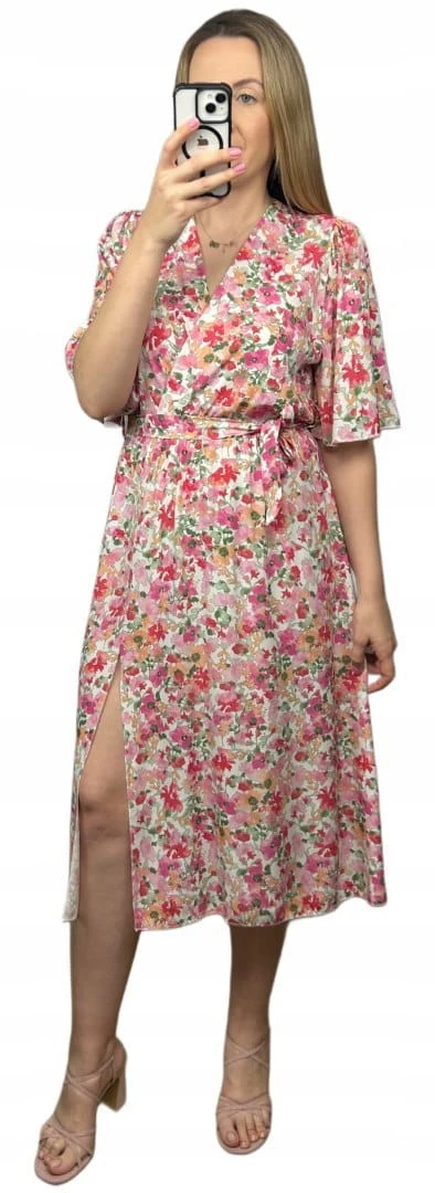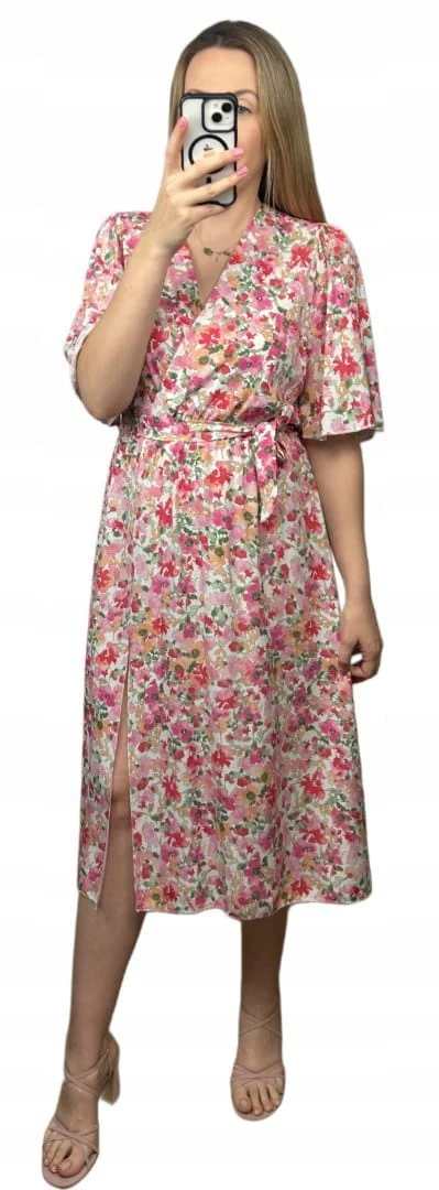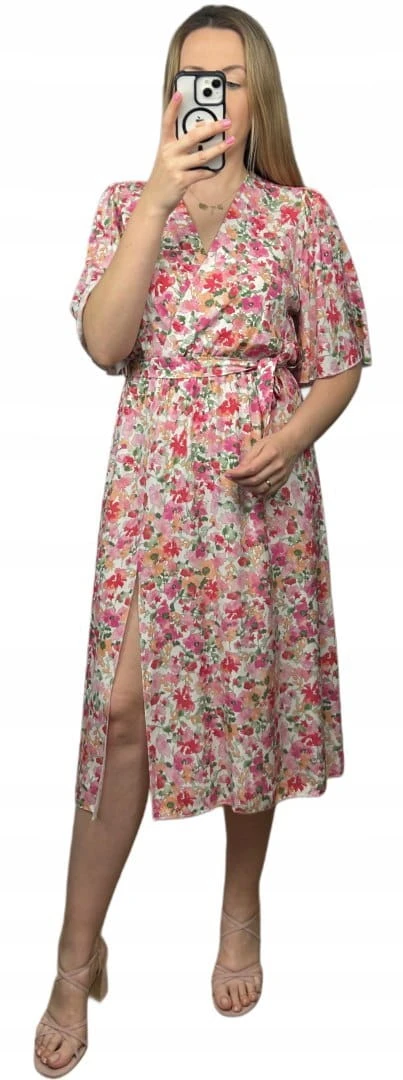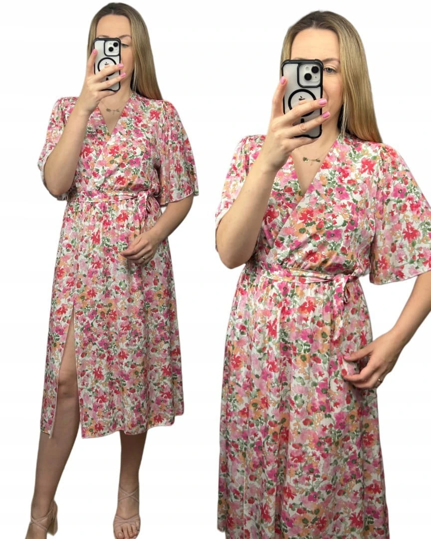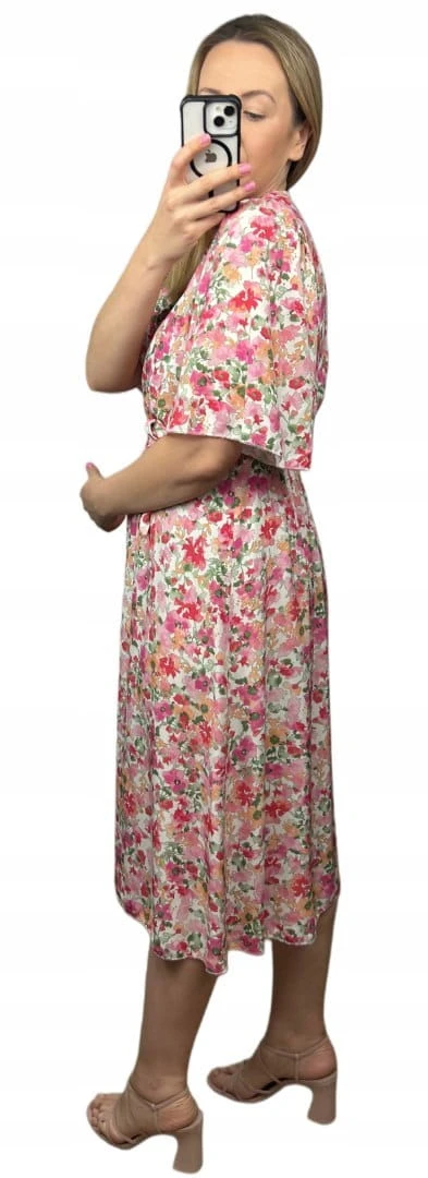 Sukienka midi kopertowy dekolt kwiaty rozcięcie wiskoza różowa jasny beż