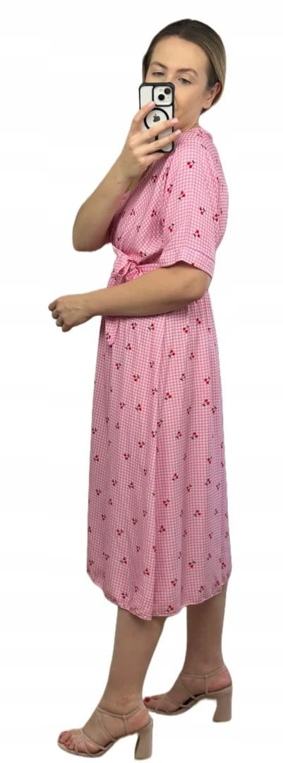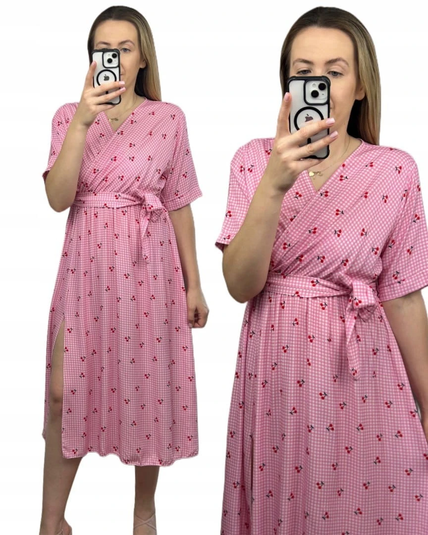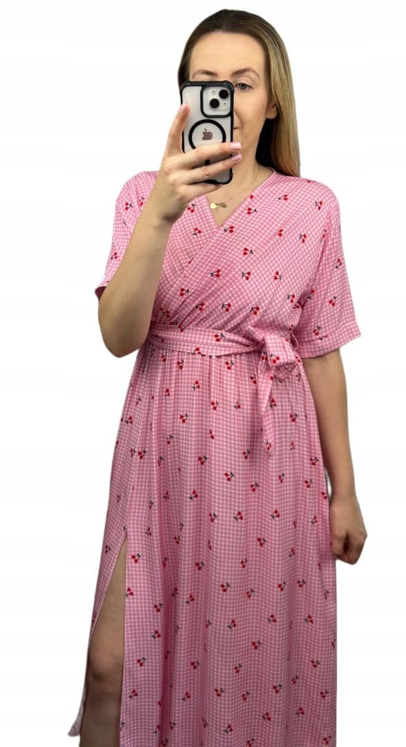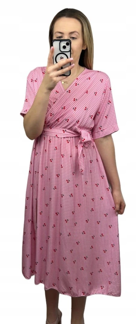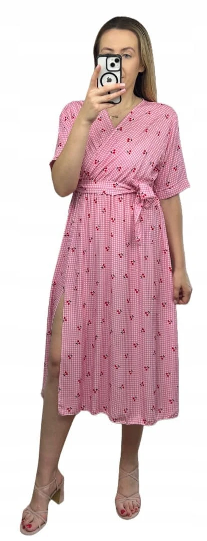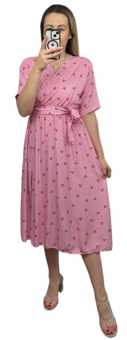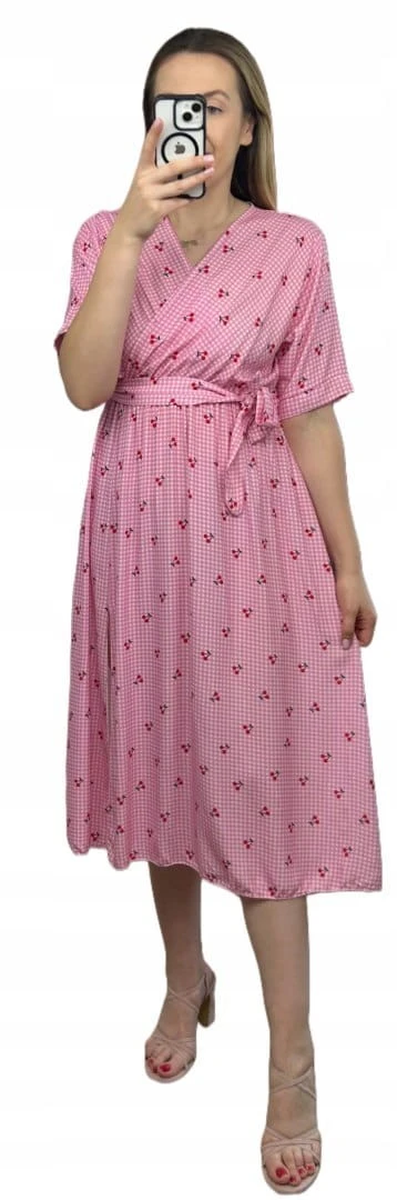 Sukienka midi kopertowy dekolt w wiśnie rozcięcie 100% wiskoza kratka