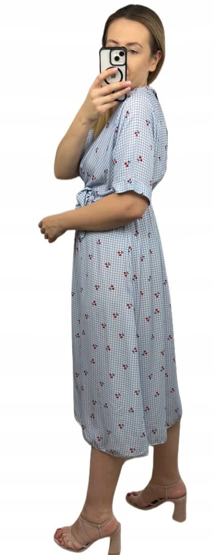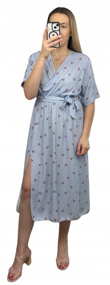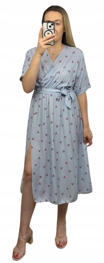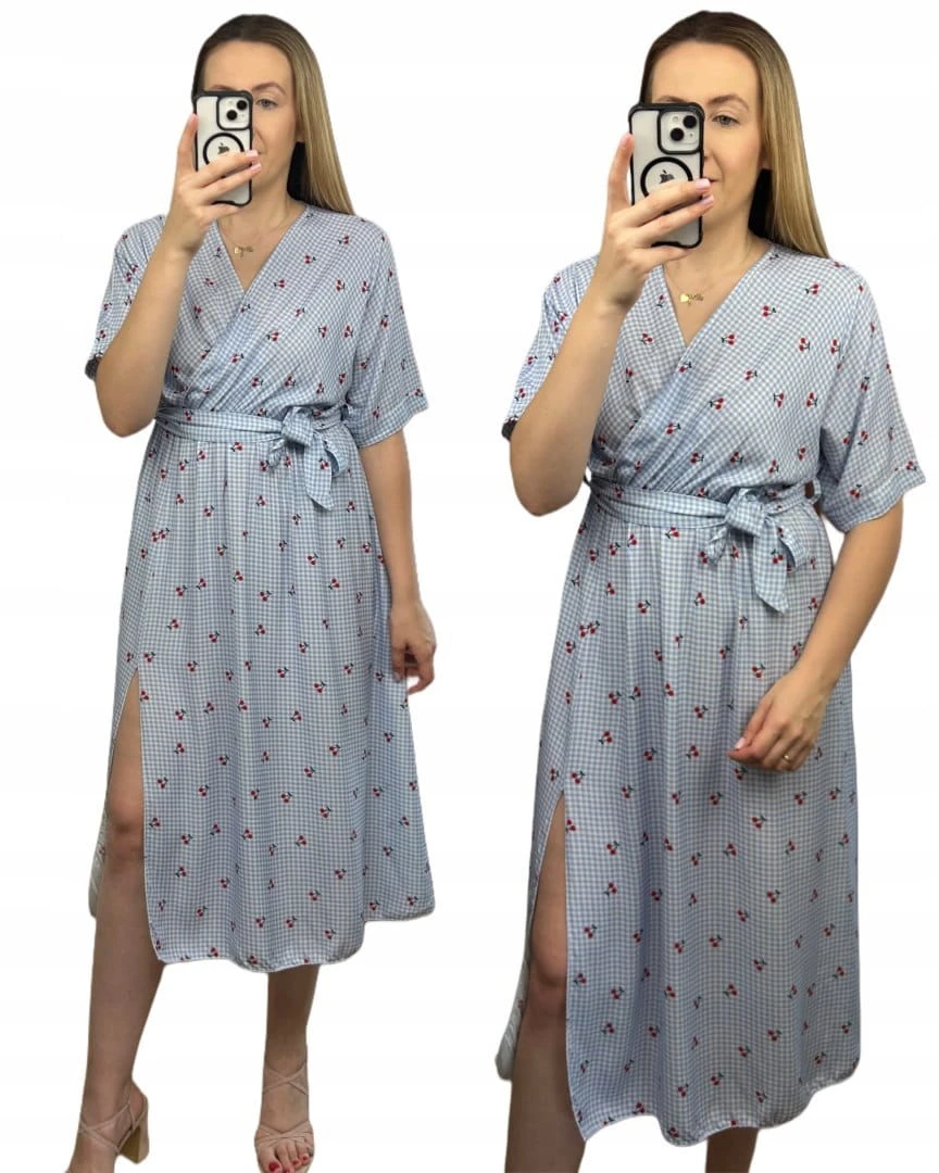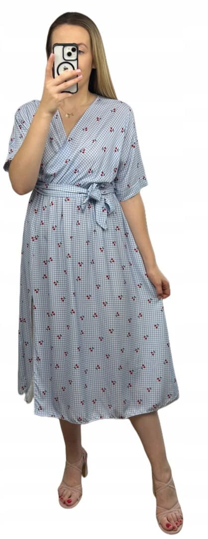 Sukienka midi kopertowy dekolt w wiśnie rozcięcie 100% wiskoza kratka