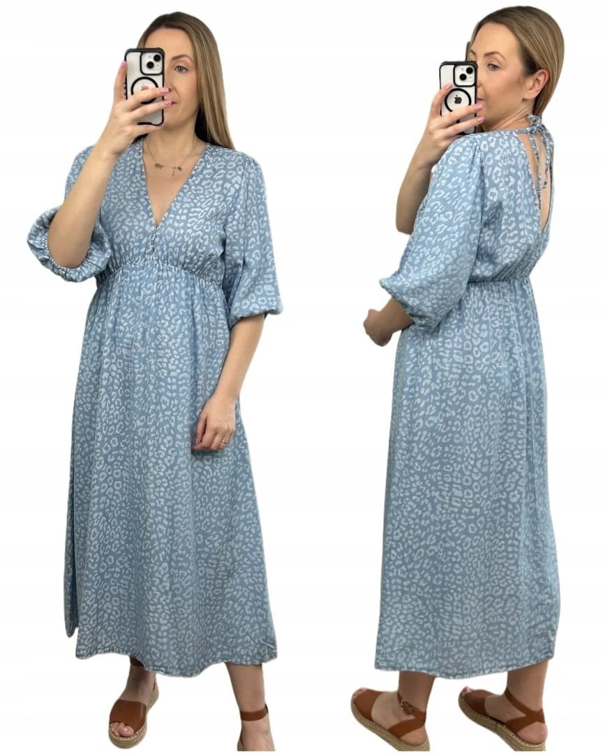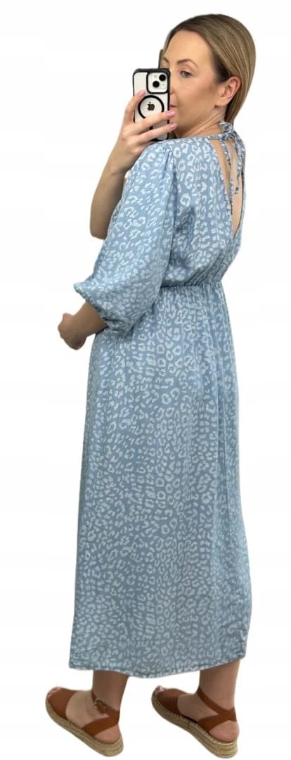 Sukienka midi letnia 100% tencel w cętki panterkę dekolt V rękaw 3/4
