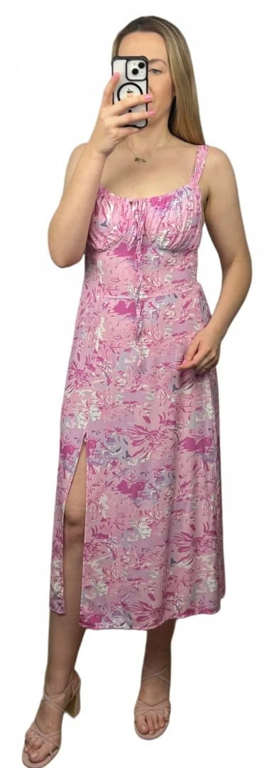 Sukienka w kwiaty na ramiączkach rozcięcie różowa lila 100% wiskoza midi
