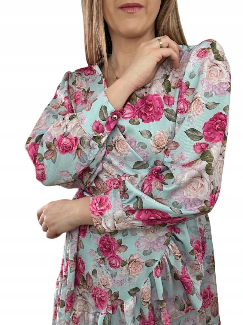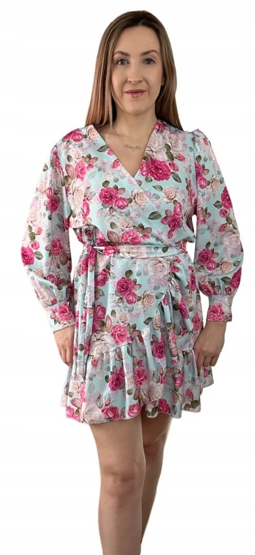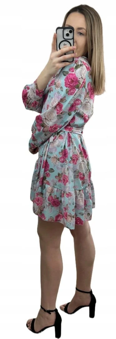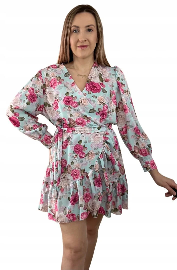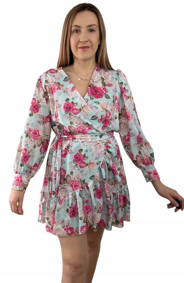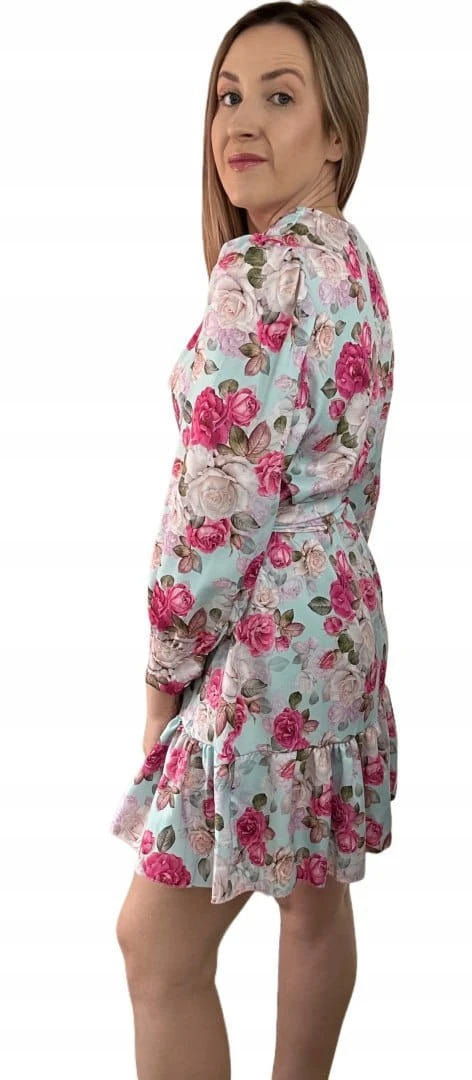 Szlafrokowa kopertowa krótka sukienka w kwiaty falbanka rękaw miętowa róż