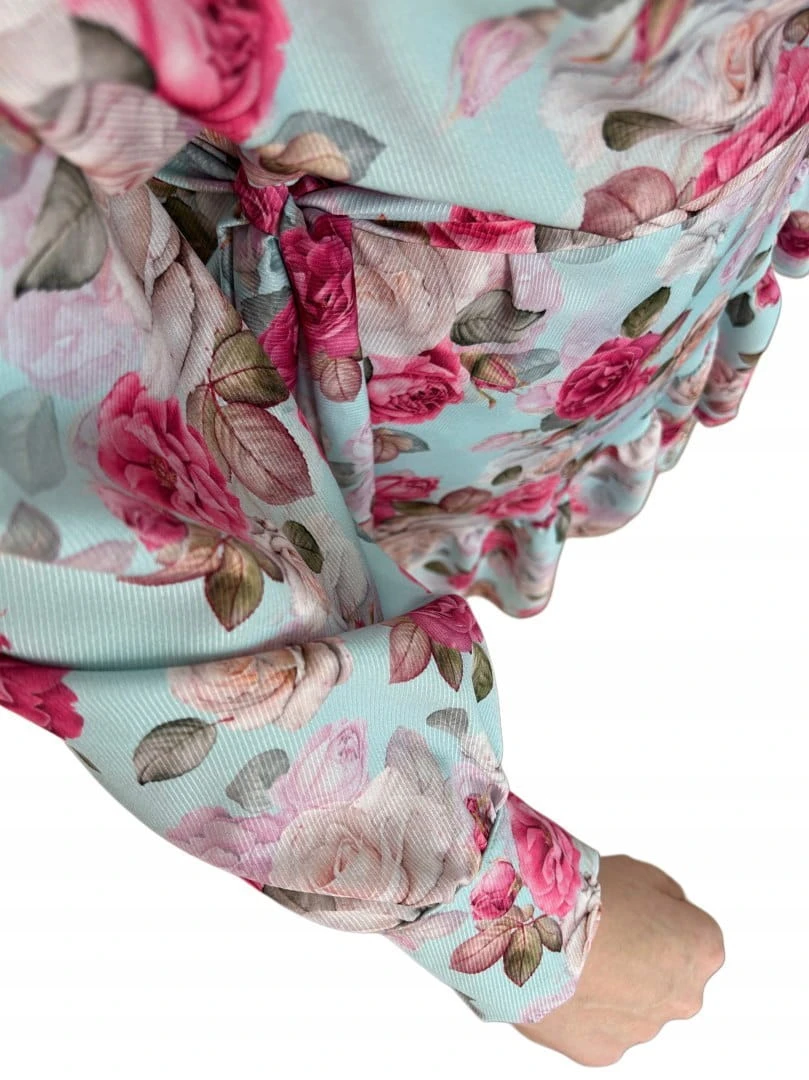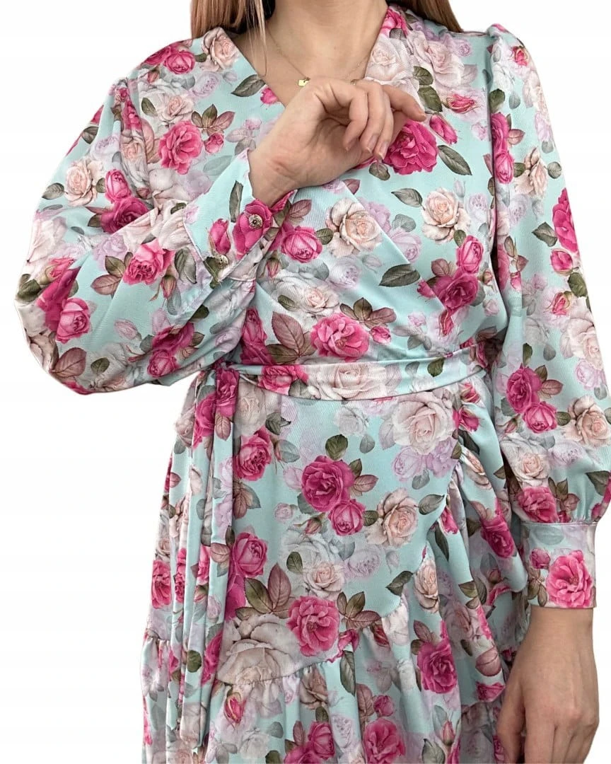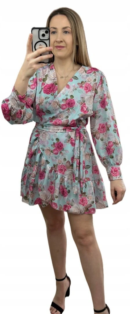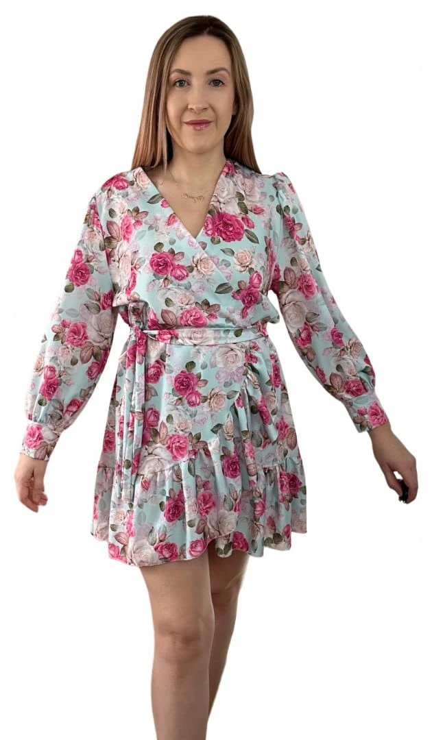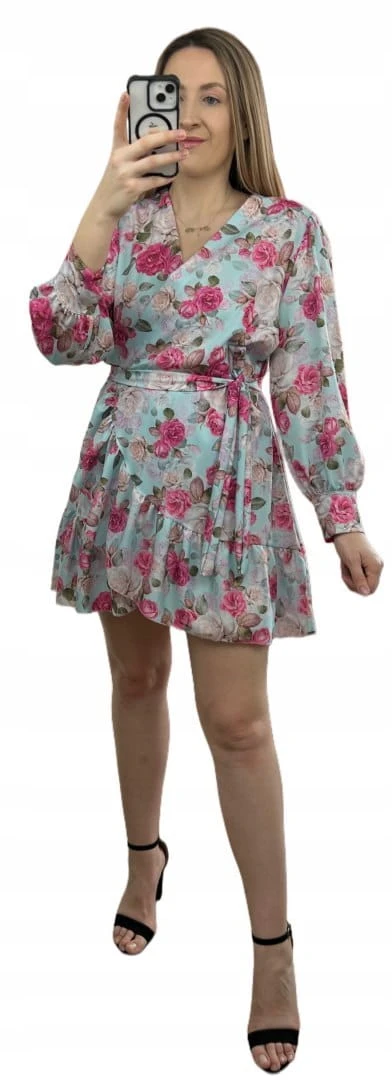 Szlafrokowa kopertowa krótka sukienka w kwiaty falbanka rękaw miętowa róż
