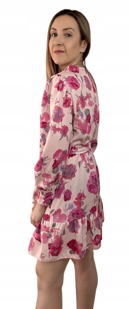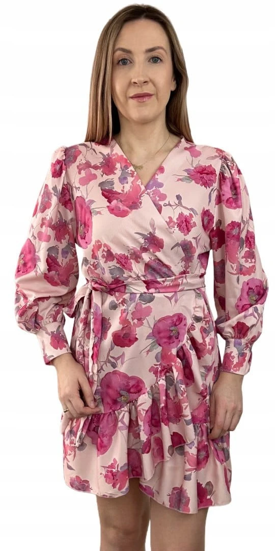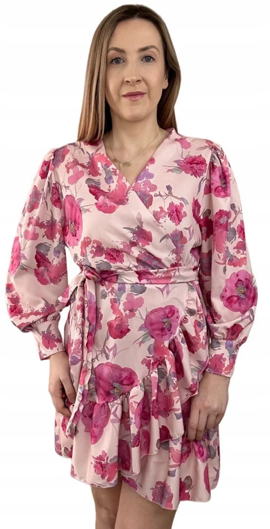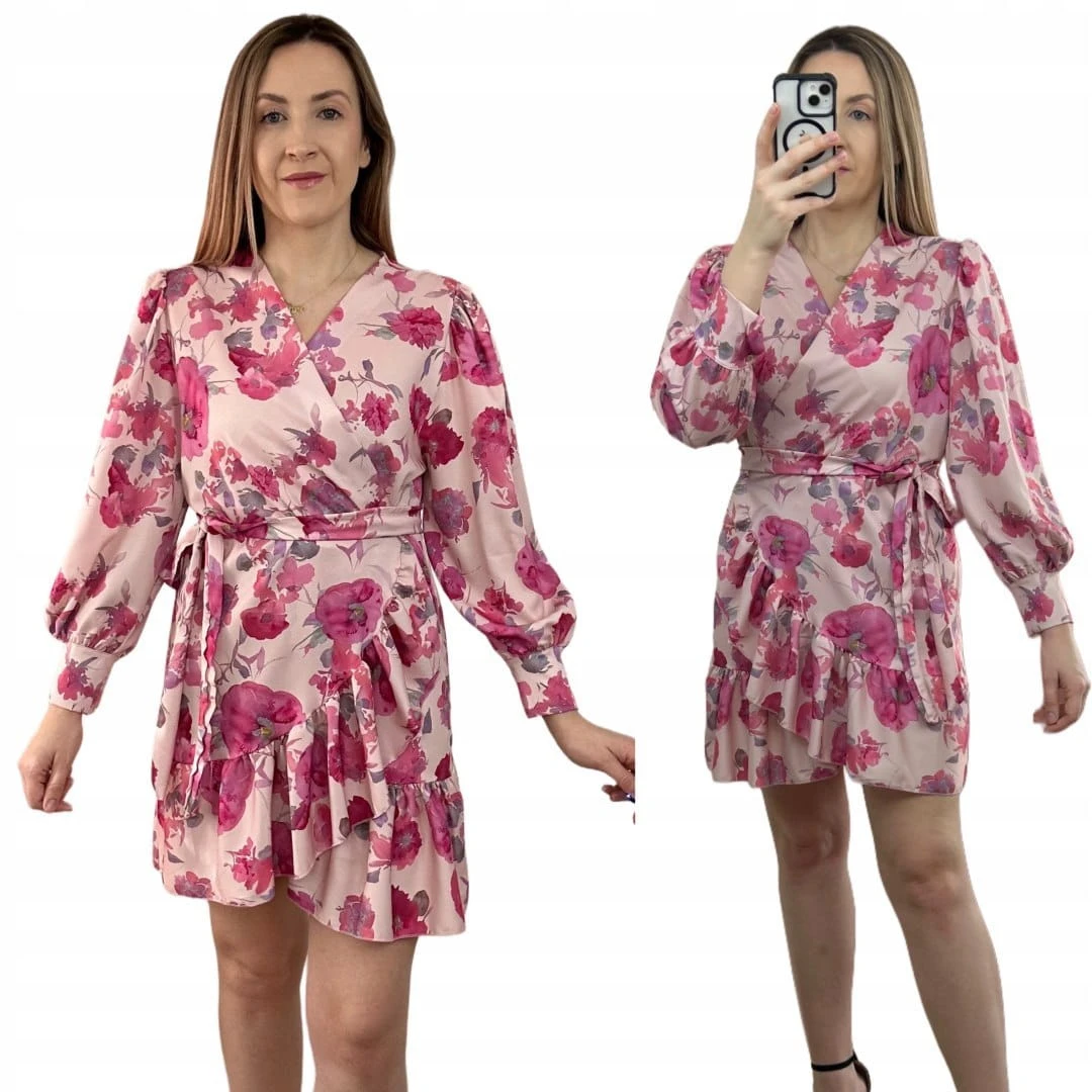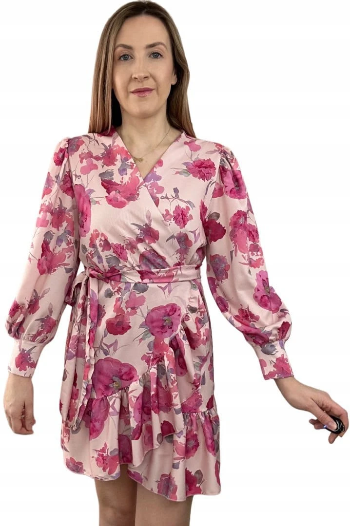 Szlafrokowa kopertowa krótka sukienka w kwiaty falbanka rękaw różowa róż