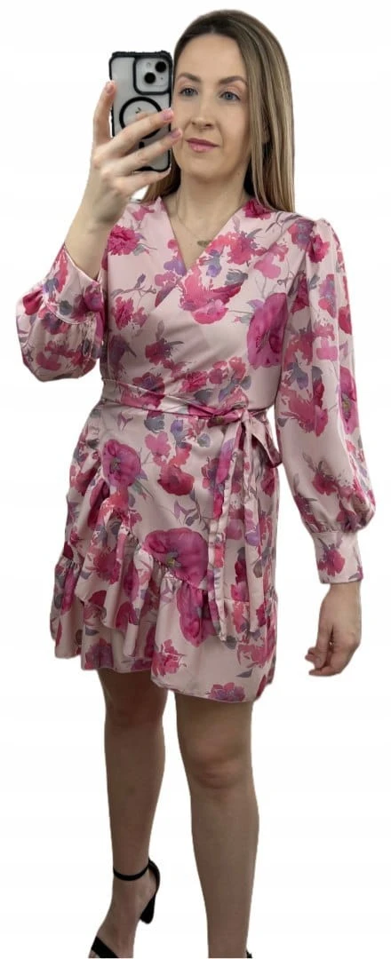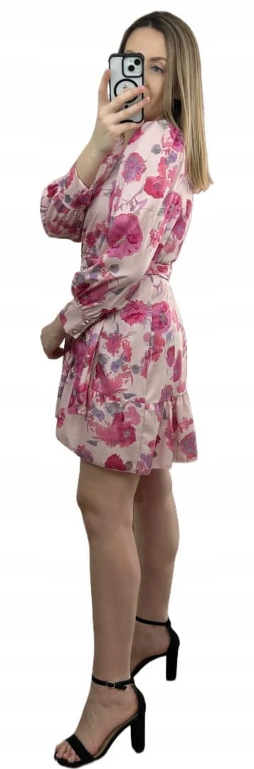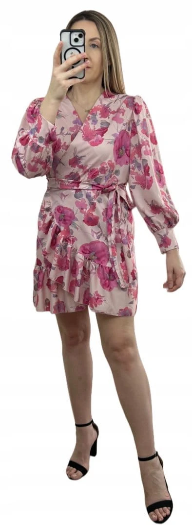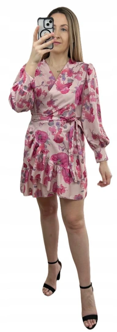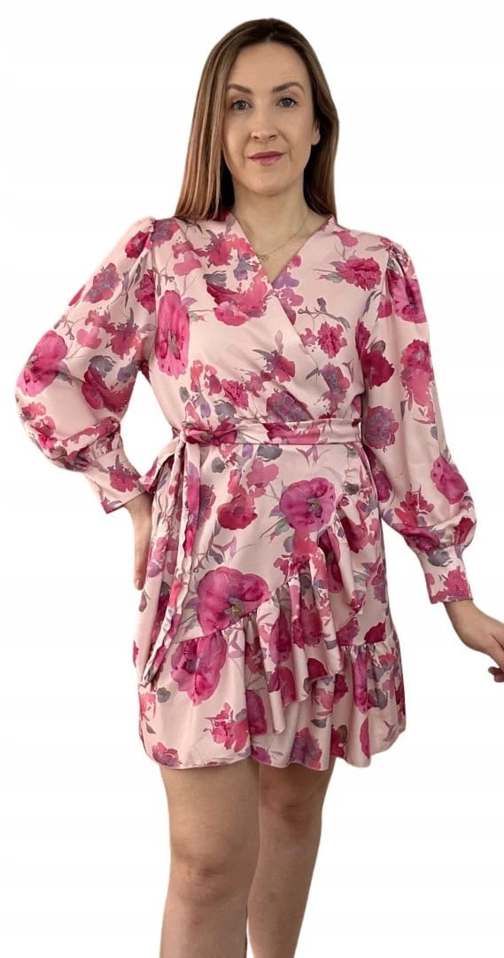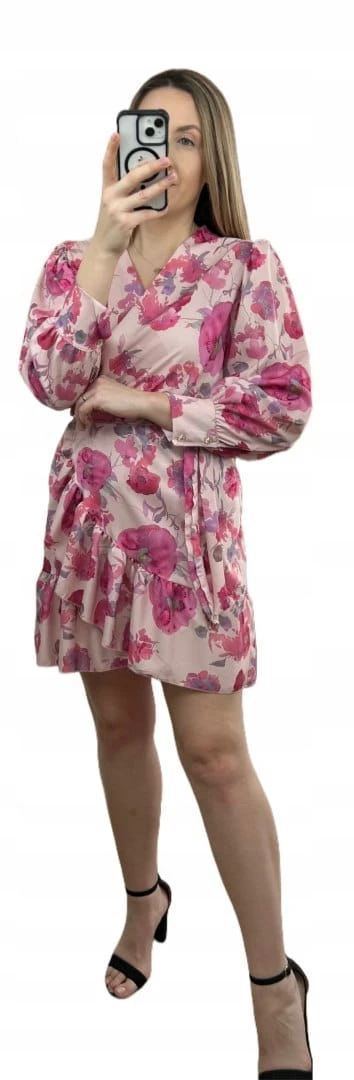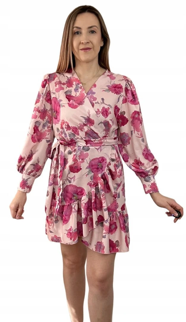 Szlafrokowa kopertowa krótka sukienka w kwiaty falbanka rękaw różowa róż