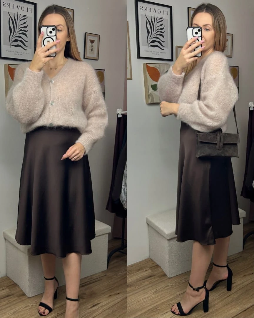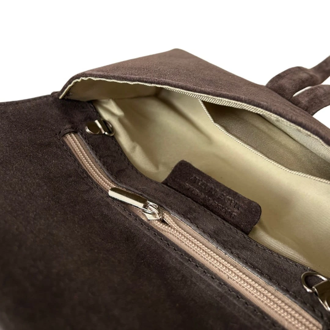 Elegancka torebka Vera Pelle ze skóry naturalnej zamszowej w głębokim, czekoladowym odcieniu. Minimalistyczny design z charakterystycznym wiązaniem na klapie nadaje jej oryginalności. Torebka ma praktyczny, regulowany pasek na ramię oraz wewnętrzną kieszonkę na suwak, co pozwala wygodnie uporządkować drobiazgi. Doskonale sprawdzi się zarówno jako kopertówka do wieczorowej sukienki, jak i jako dodatek do codziennych, casualowych stylizacji.