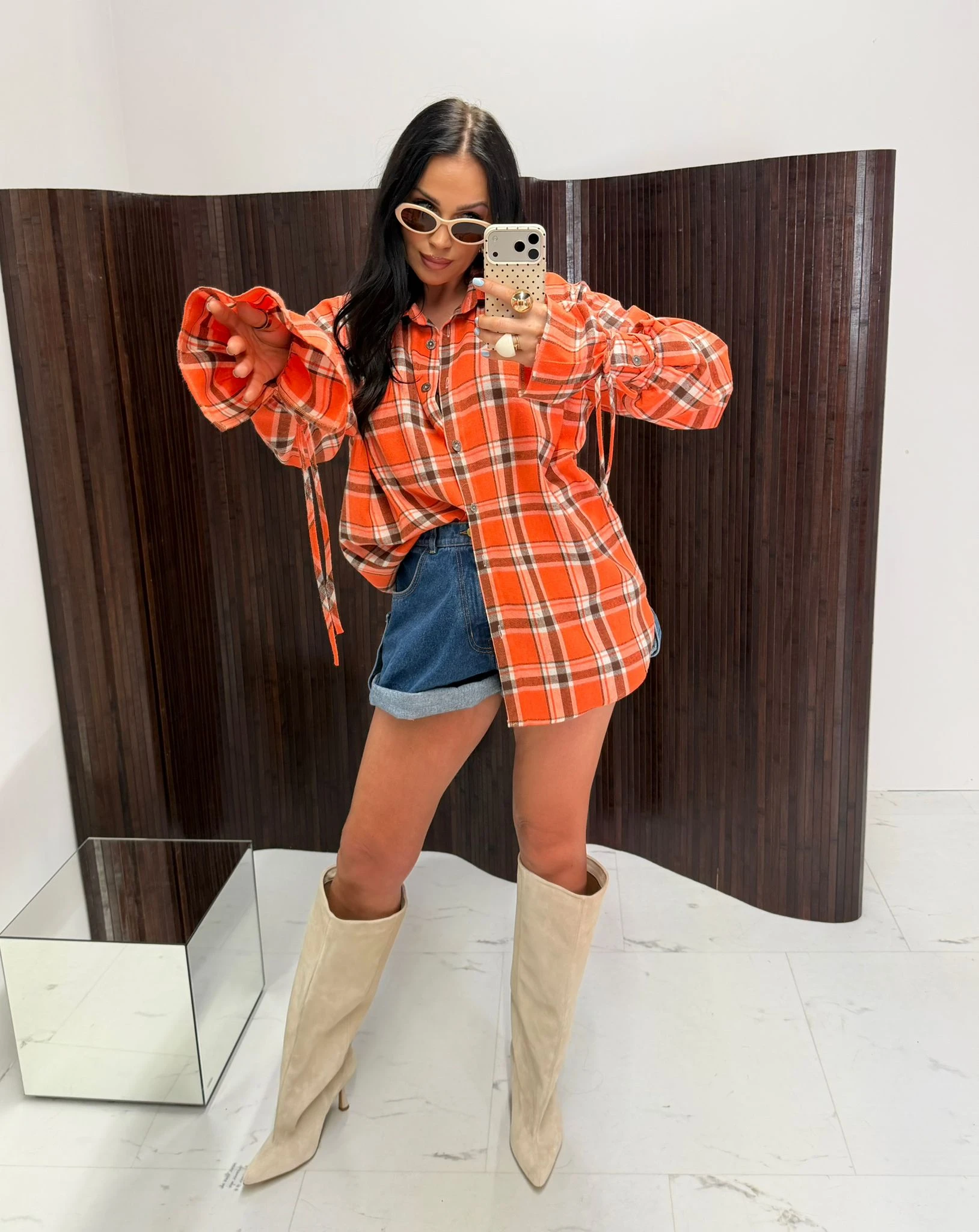 Koszula pomarańczowa biała bawełniana dzwonek w kratę szerokie mankiety La Milla