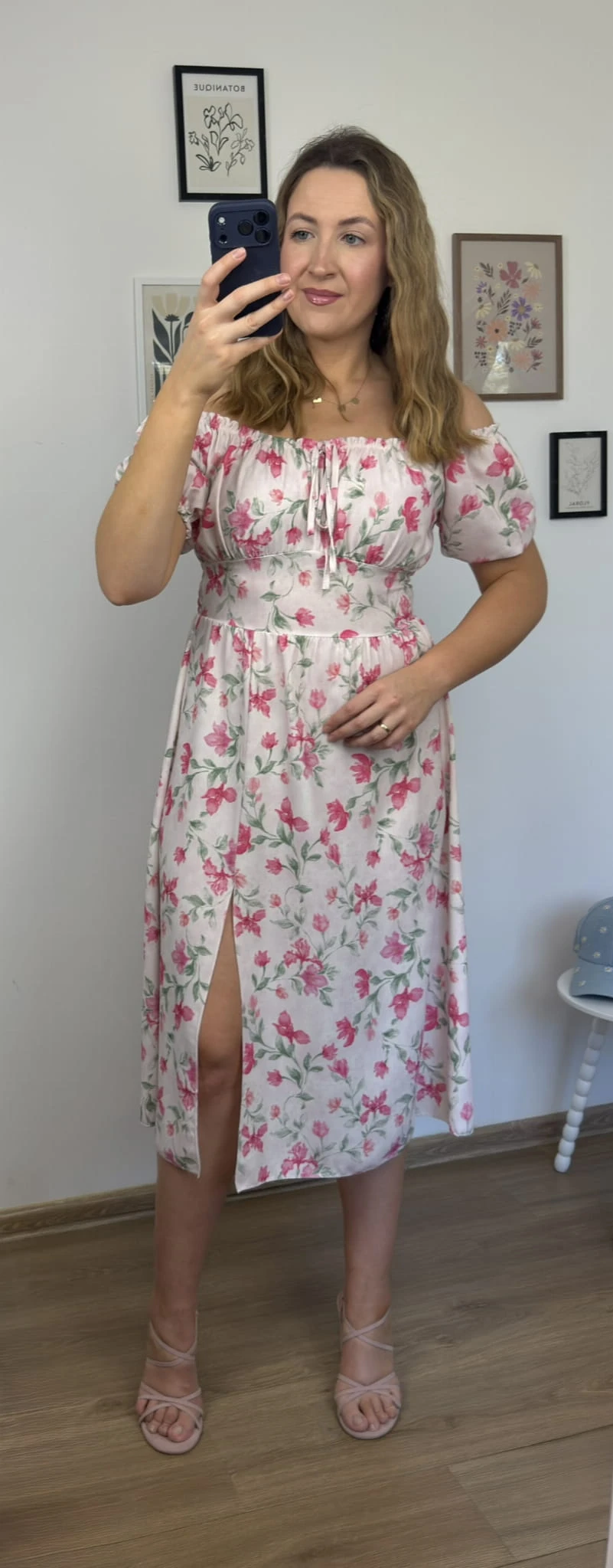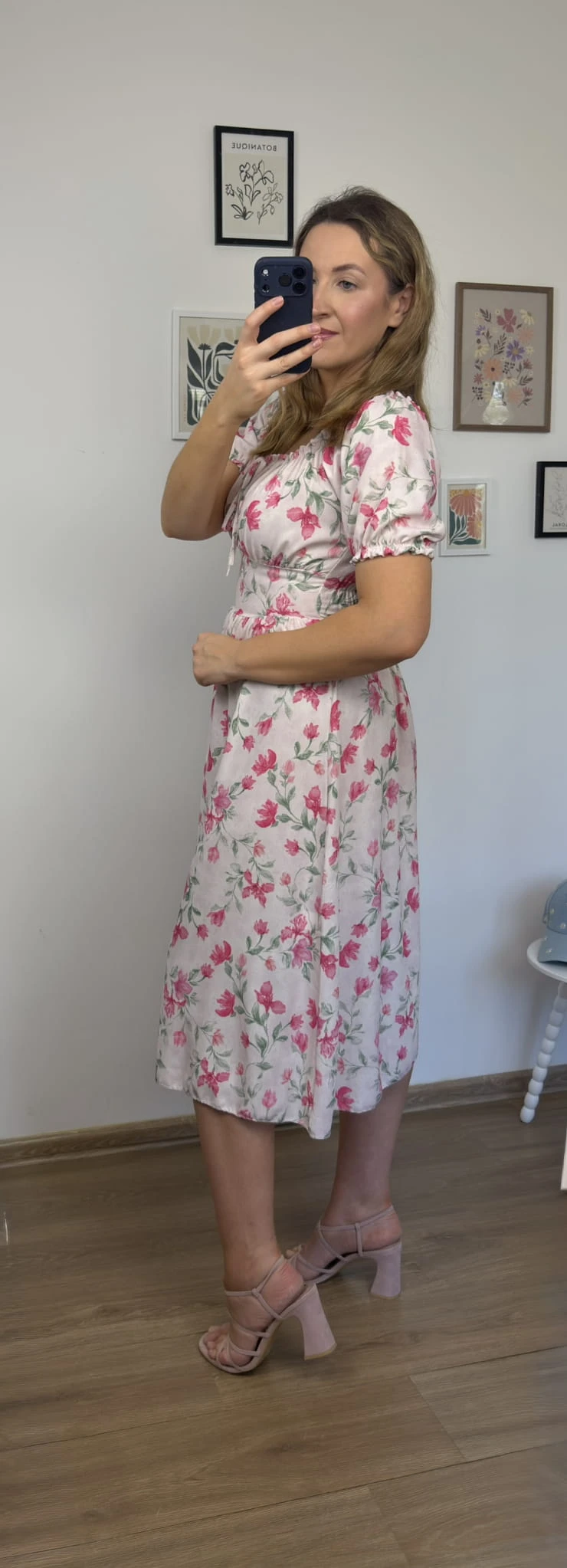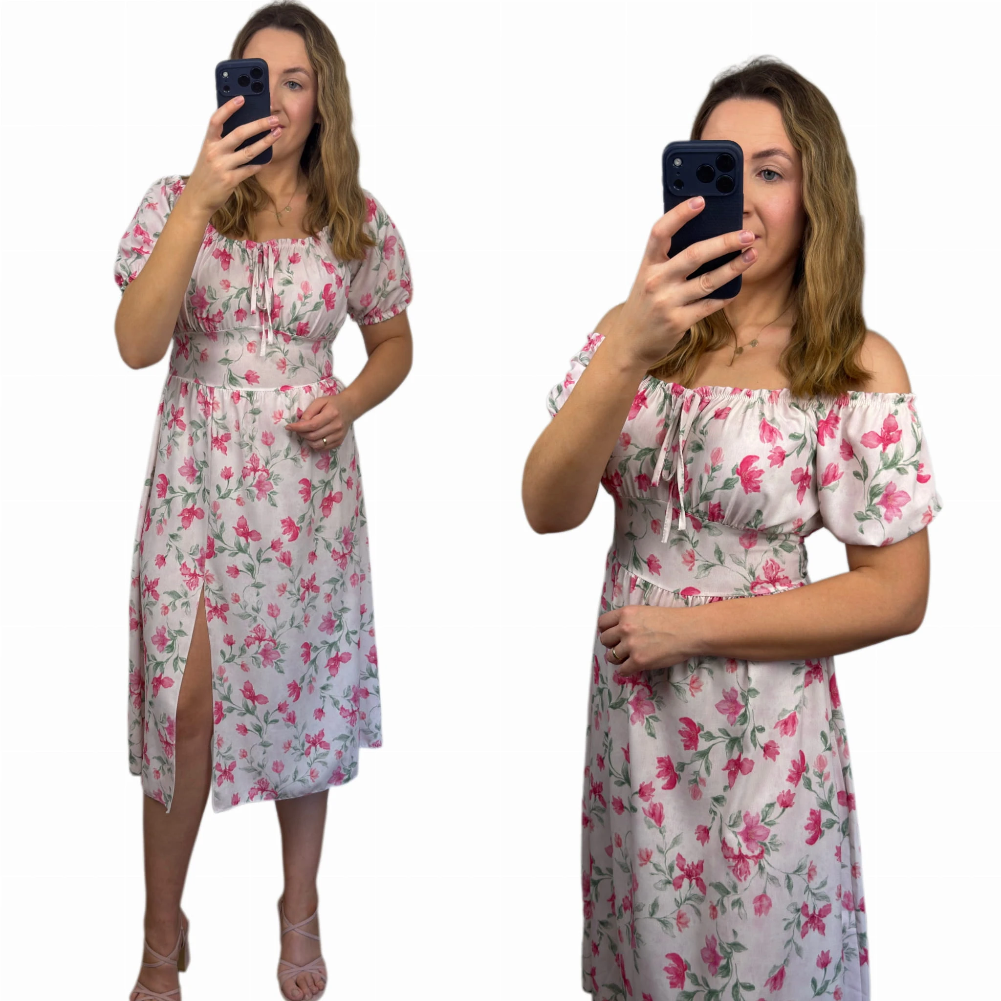 Sukienka FIORELLA midi w różowe kwiaty z rozcięciem – wiskoza, hiszpanka
