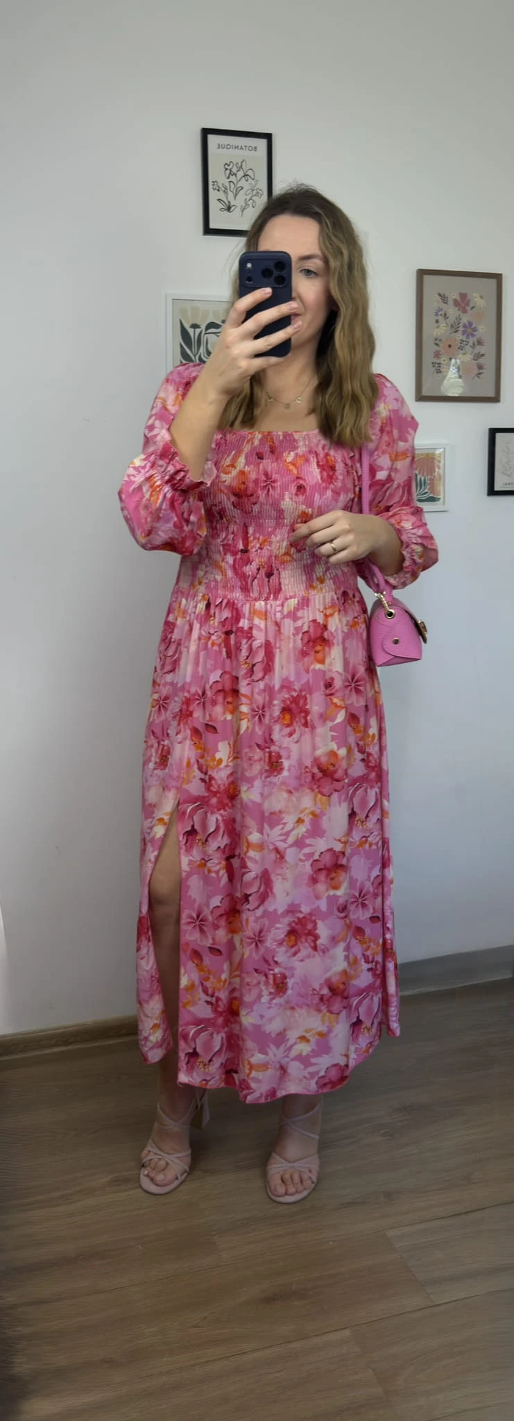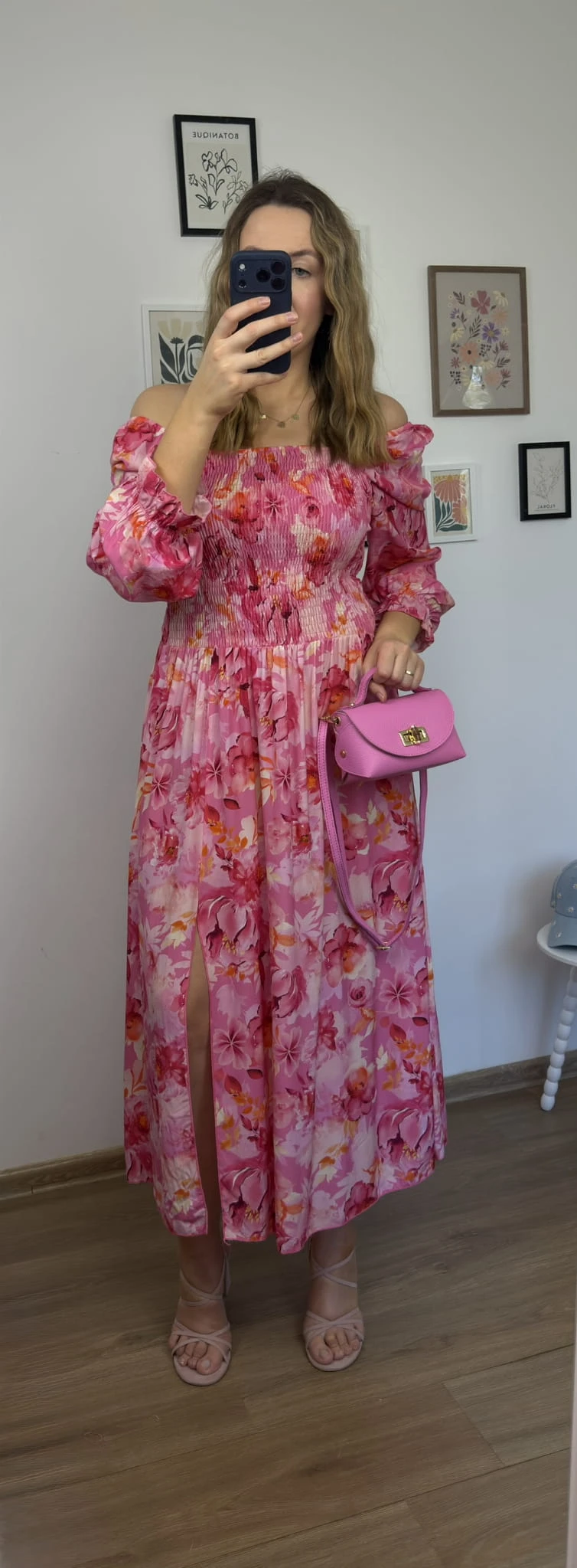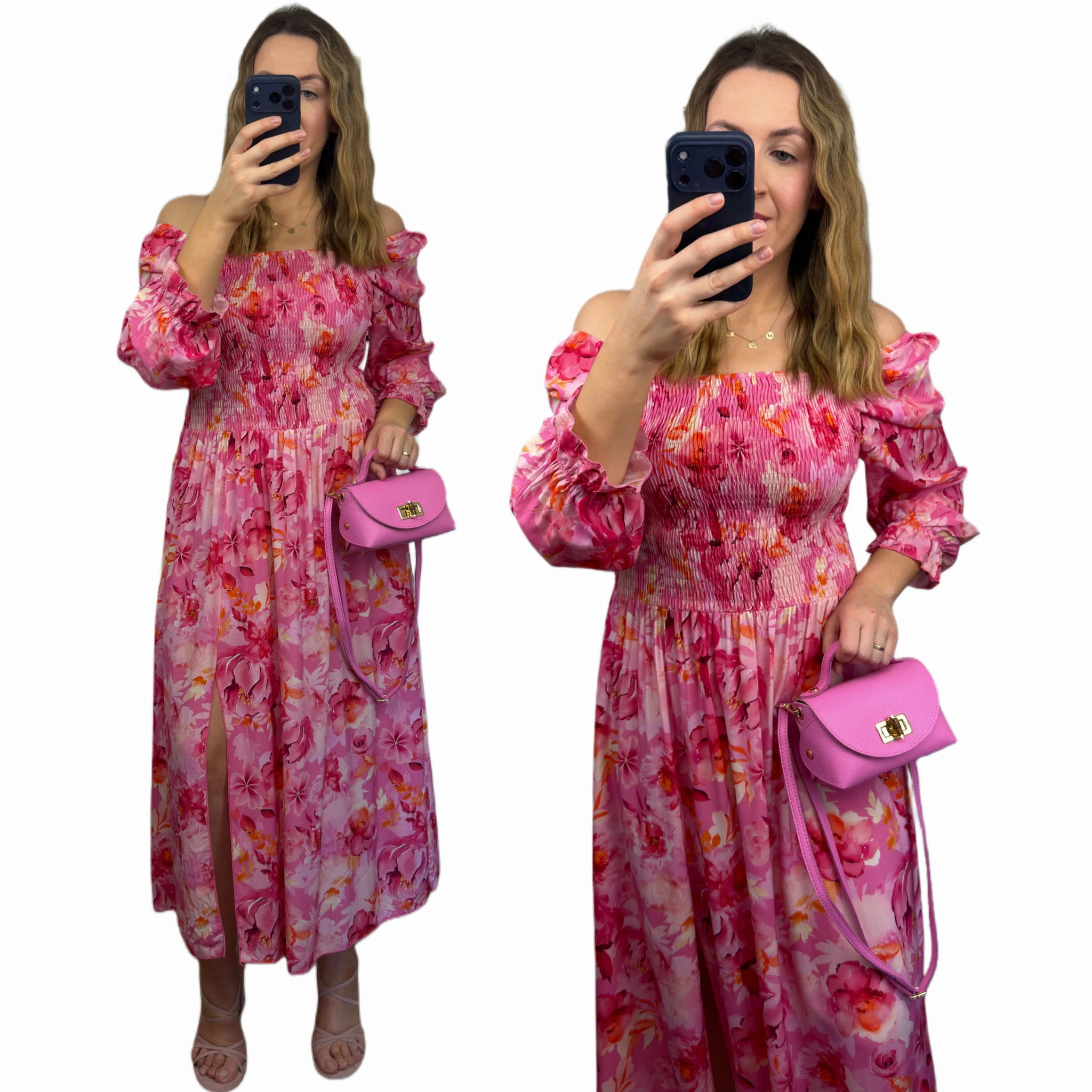 Zwiewna różowa sukienka maxi hiszpanka 100% wiskoza rozcięcie kwiatowy print LORENA