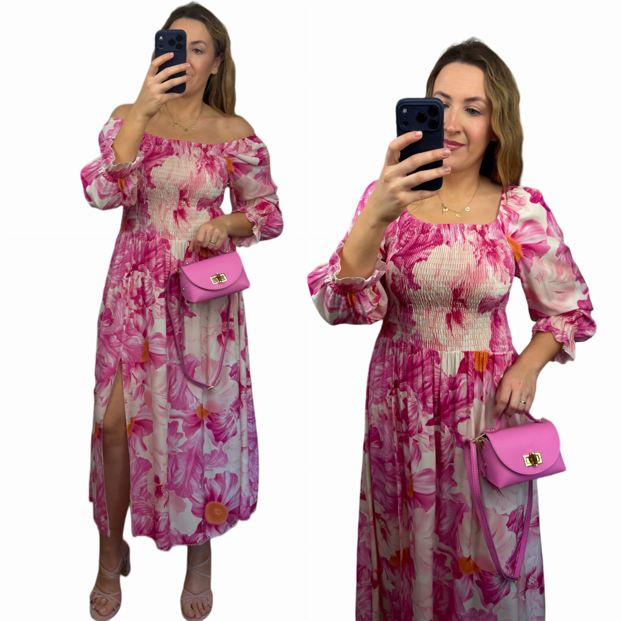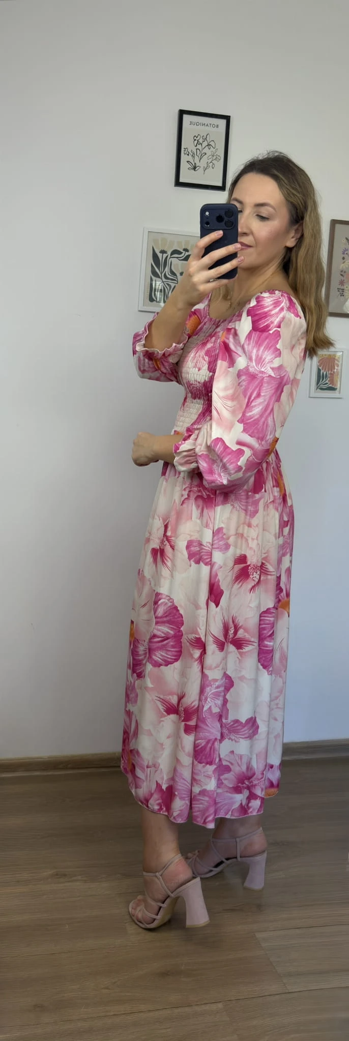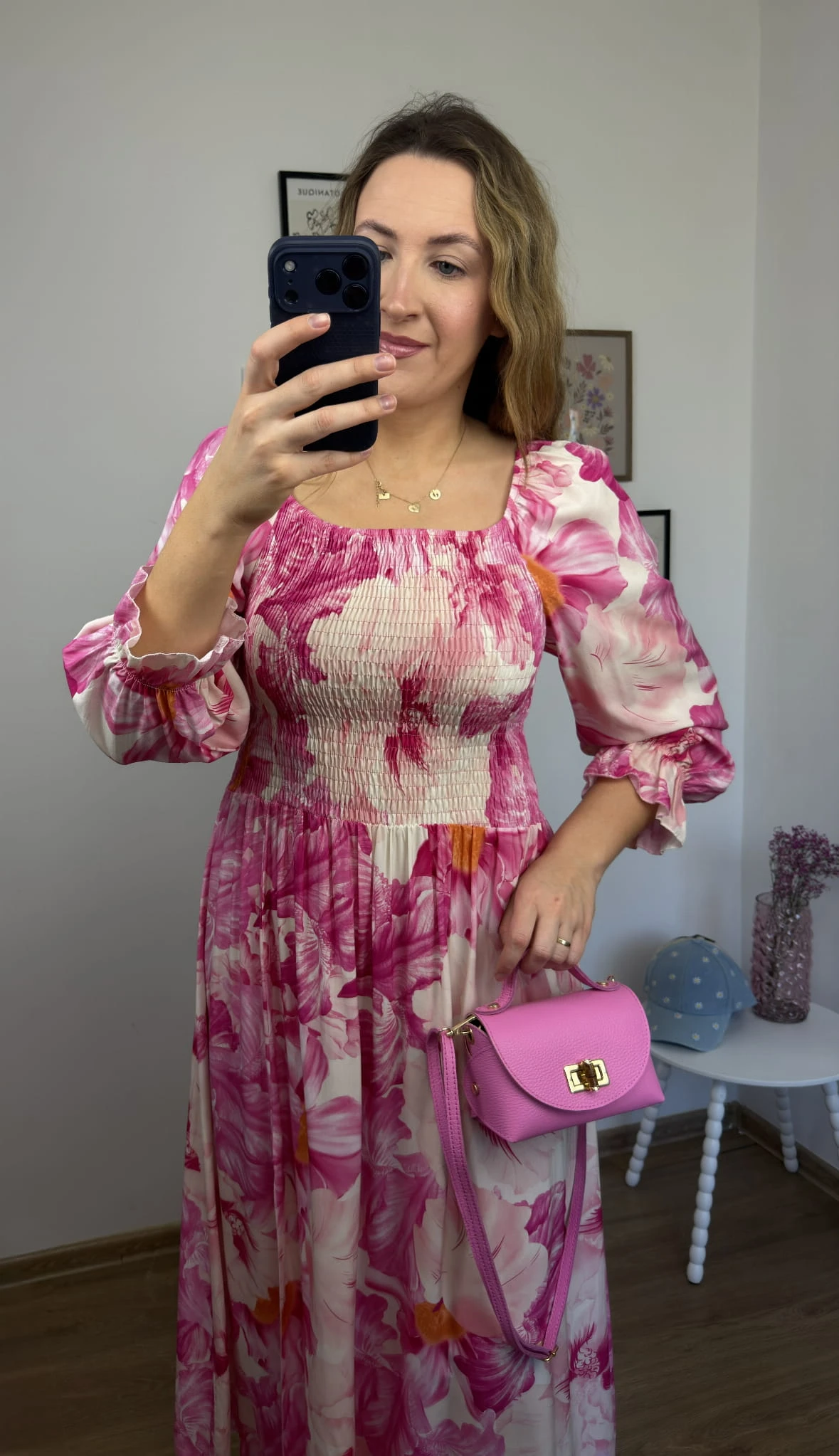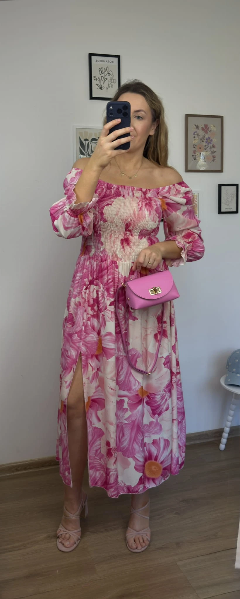 Zwiewna różowa sukienka maxi hiszpanka 100% wiskoza rozcięcie kwiatowy print LORENA