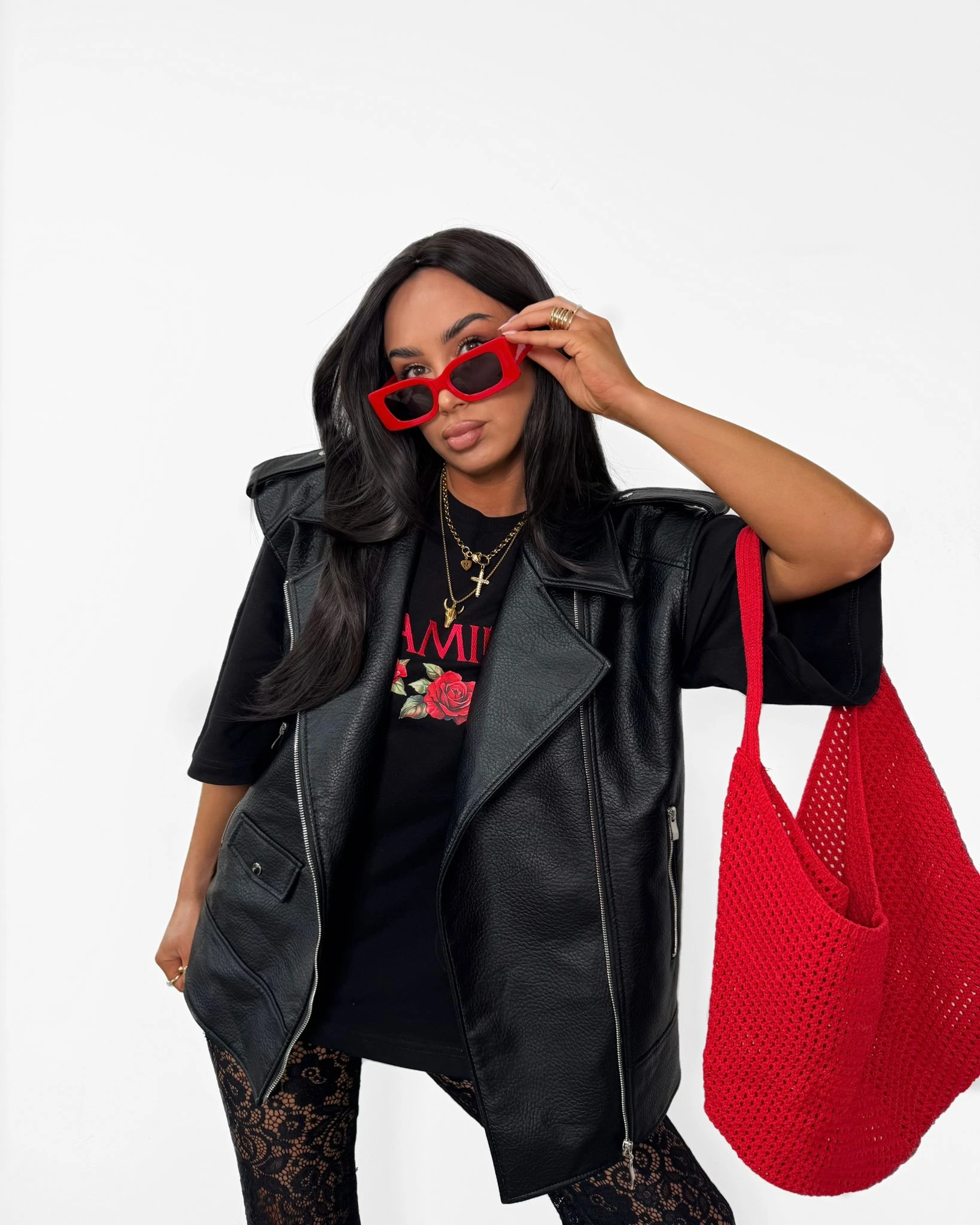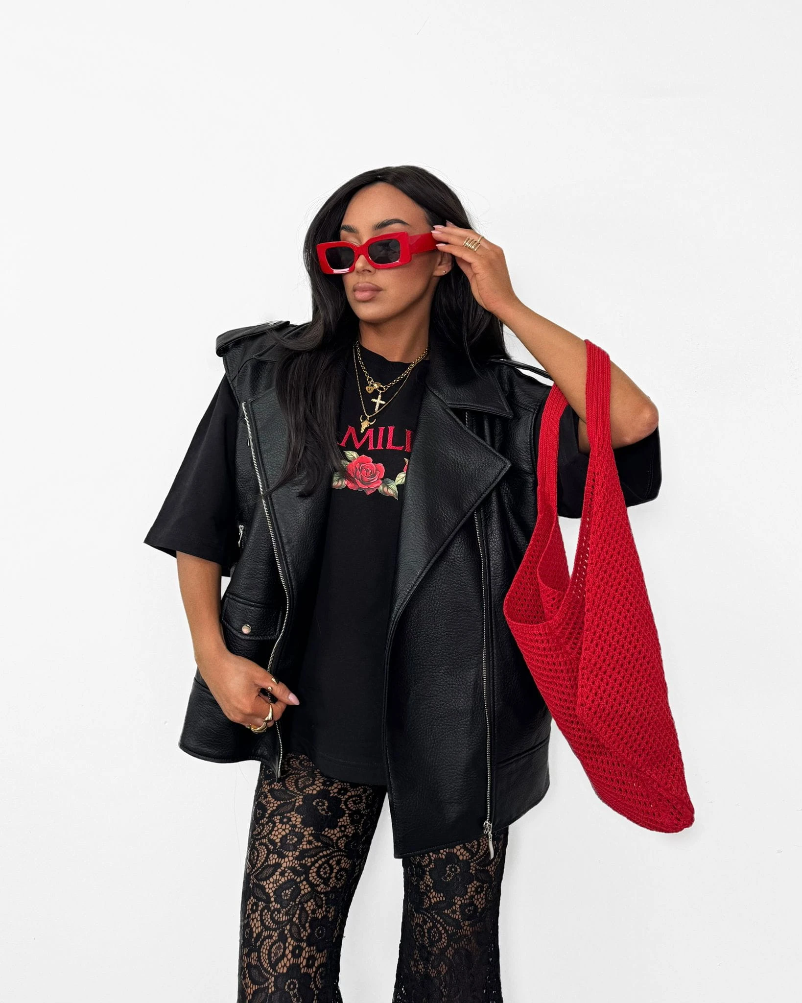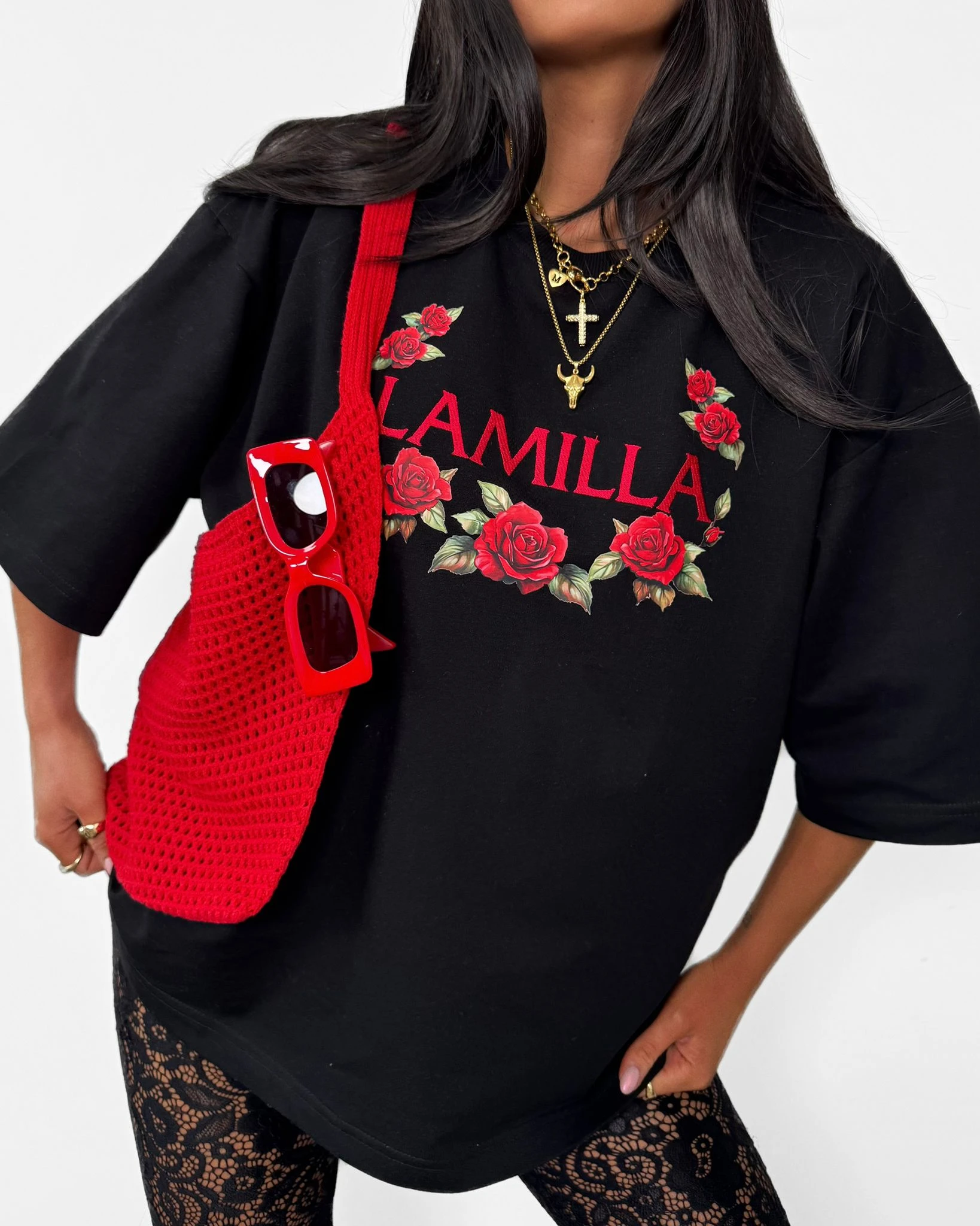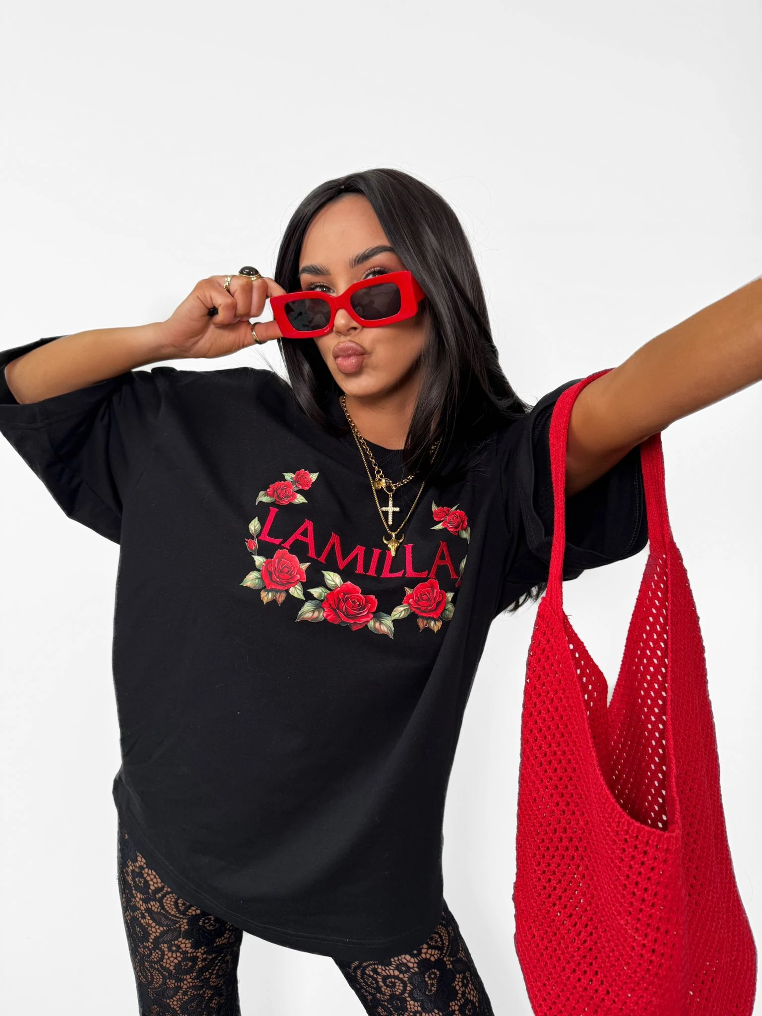 T-shirt czarny haft LAMILLA oversize czerwone róże LA MILLA