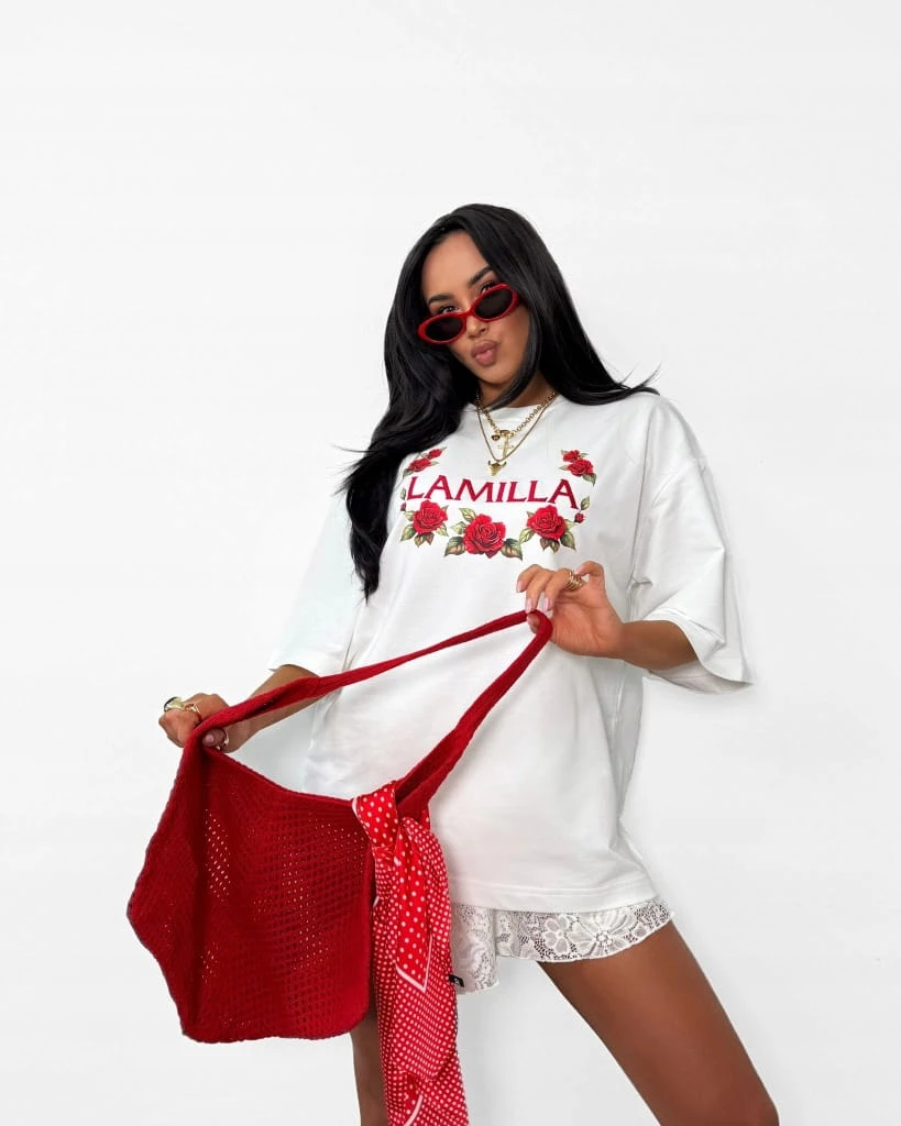 T-shirt biały haft LAMILLA oversize czerwone róże La Milla