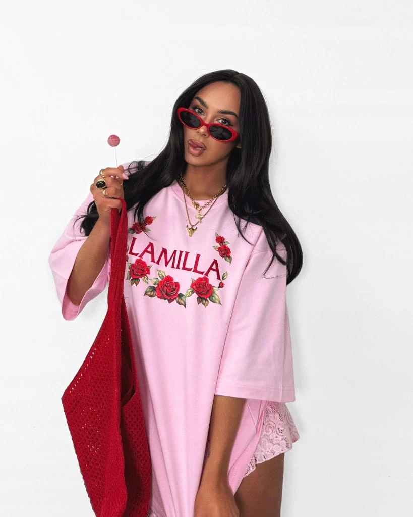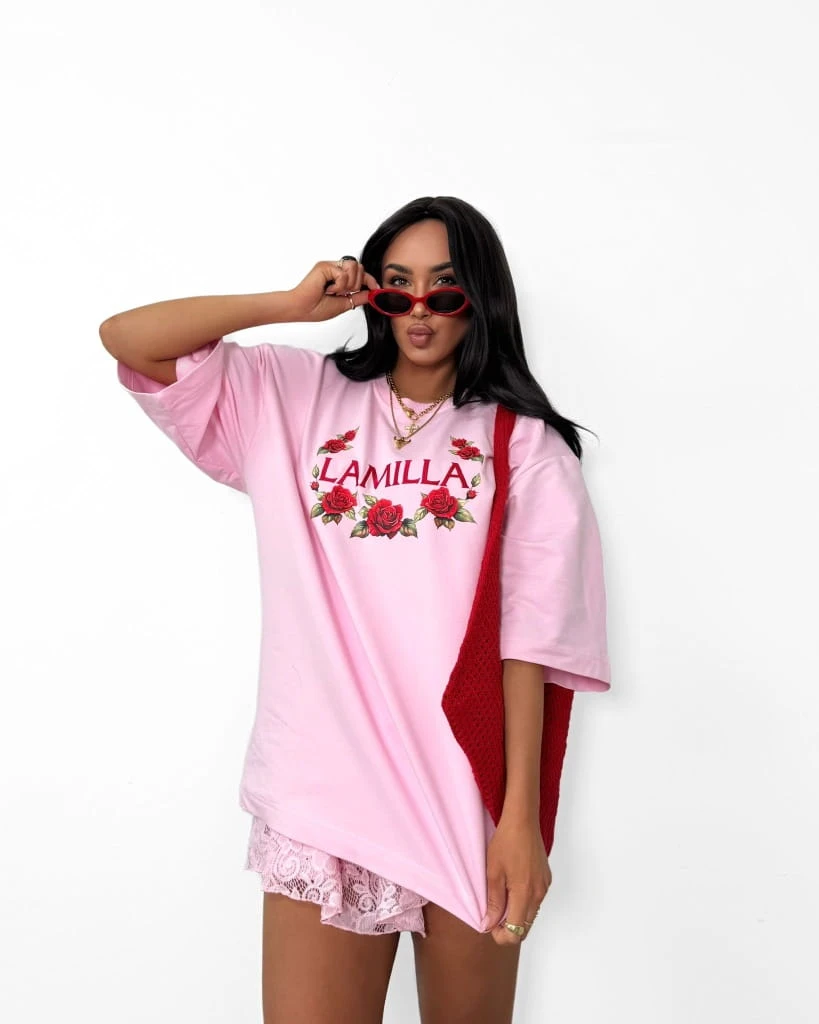 T-shirt różowy haft LAMILLA oversize czerwone róże La Milla